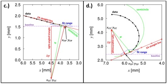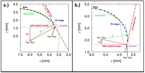 where m and b are the slope and the axis intercept of the baseline, respectively, and XMP,YMP define the mean radius R and the center of a fitting semi-circle (compare to Section 2.4). The physically practical signs in Equation (18) depend on the considered side of the droplet (+ ≡ right side of the droplet; − ≡ left side of the droplet).