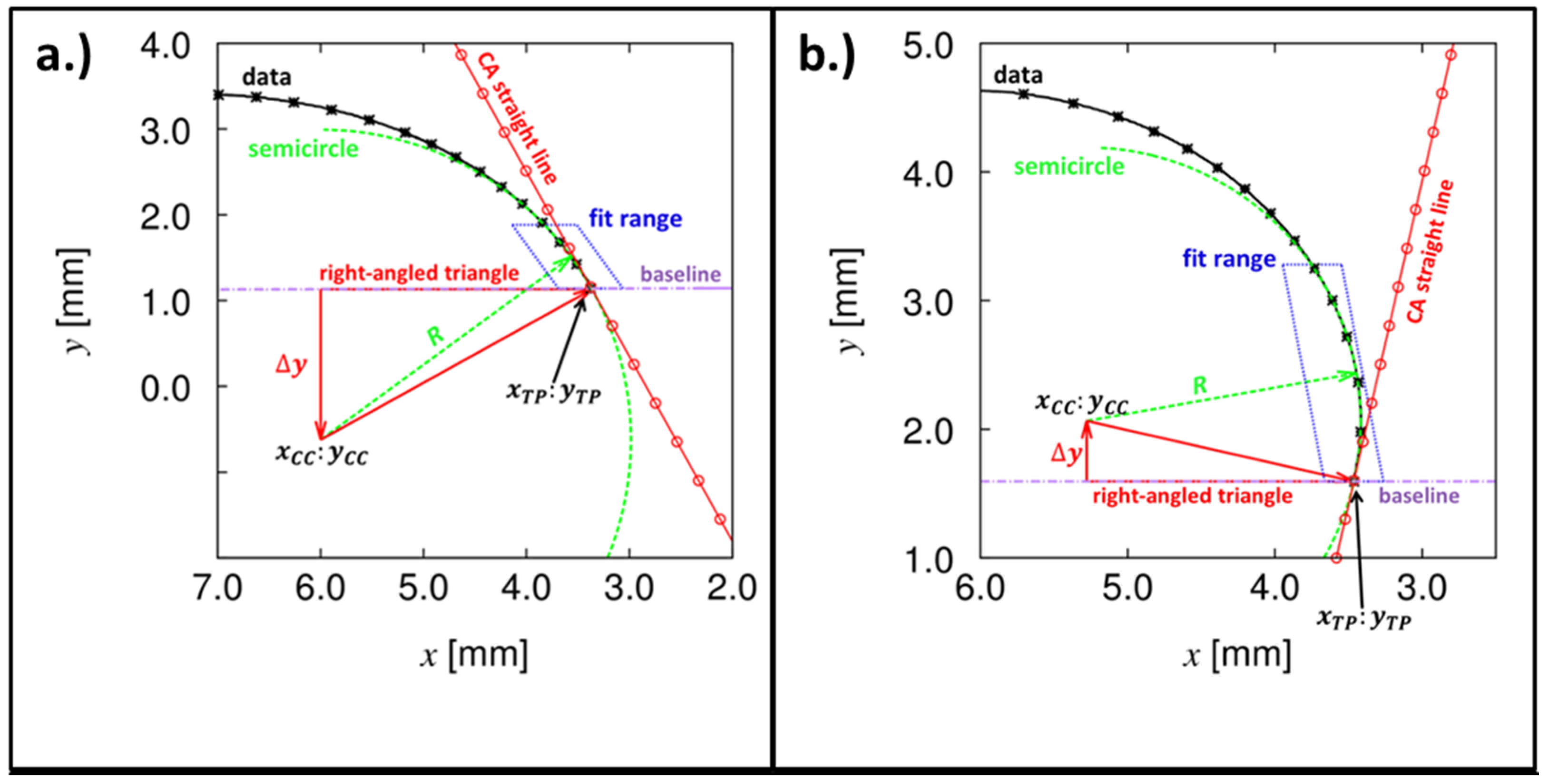 where is the inclination angle of the baseline (to correct non-horizontal baselines) and is the difference in height coordinates between the triple points and the center of the fitting circle. A schematical visualization of the fitting procedure and the contact angle calculation is illustrated in Figure 2.