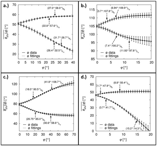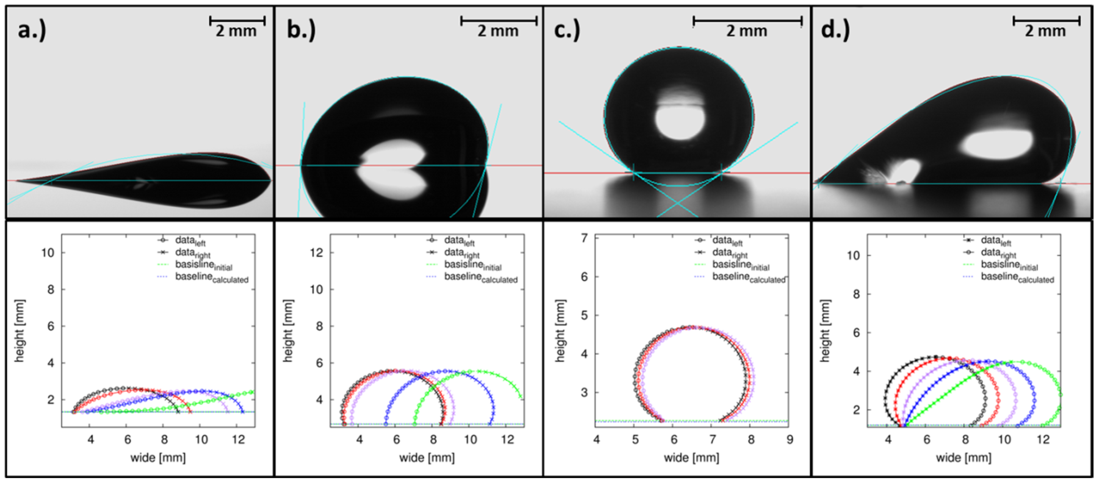 As illustrated in Figure 3, the SCA20 software results in a large error by calculating the contact angles, especially for the “extreme” wetting situations (Figure 3a,c,d) because the whole drop shape is considered to fit one ellipse function on the highly asymmetric drop contours. However, also in the more practical contact angle range (Figure 3b, ), the SCA20 results in a small but optical visible error of about ±4°. Due to the fact that one ellipse function is fitted onto the drop shape, the contact angle determination on the right side strongly depends on the one on the left side. Therefore, highly asymmetric drop shapes, such as in Figure 3a,d, cannot be evaluated with the SCA20. This problem is solved in HPDSA by splitting the drop shape in two parts, which results in the possibility to individually fit the left-hand and right-hand side of the drop shape independent of each other. The corresponding contact angle calculations with HPDSA for the measurements in Figure 3 are illustrated in Figure 4.