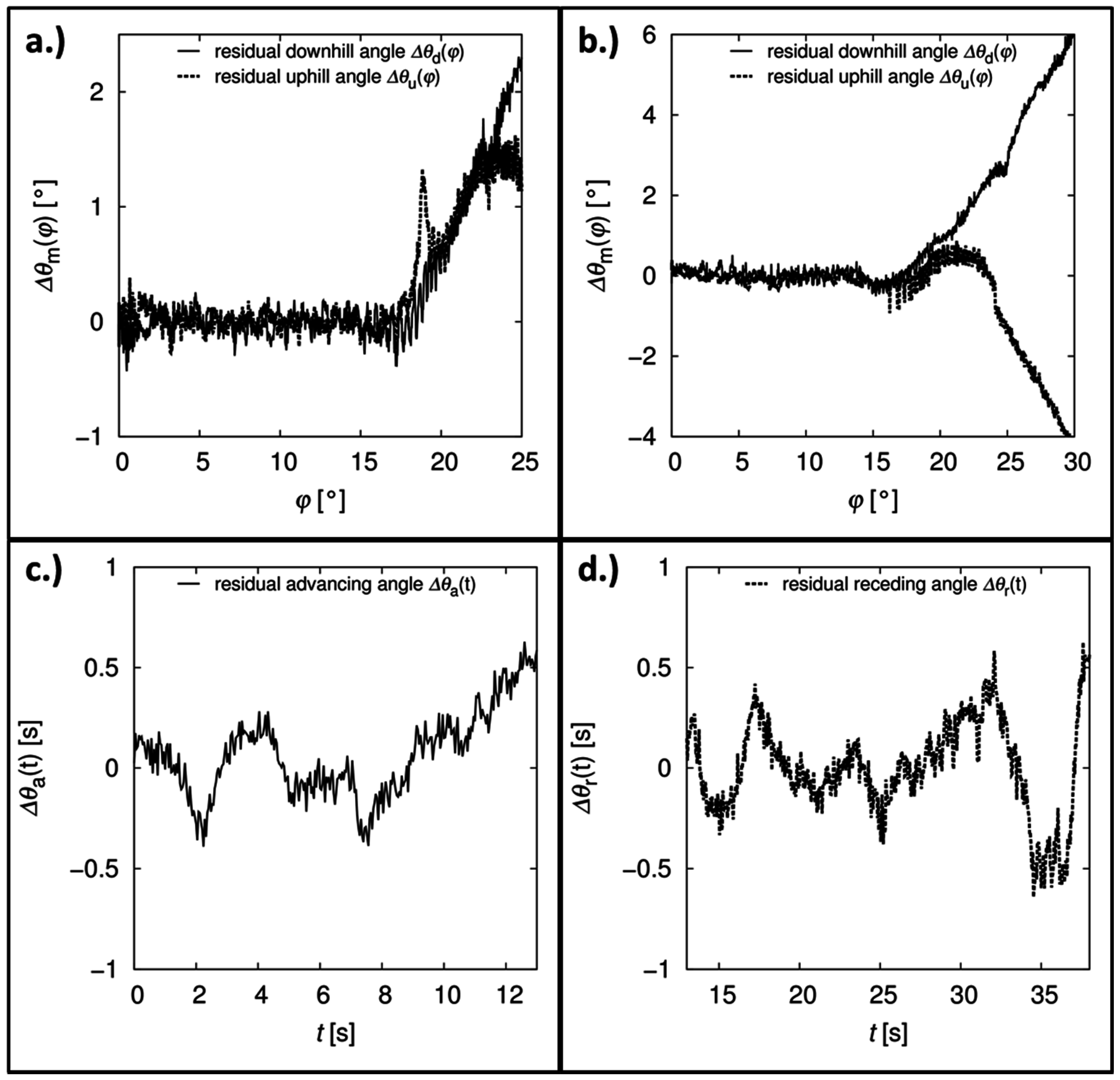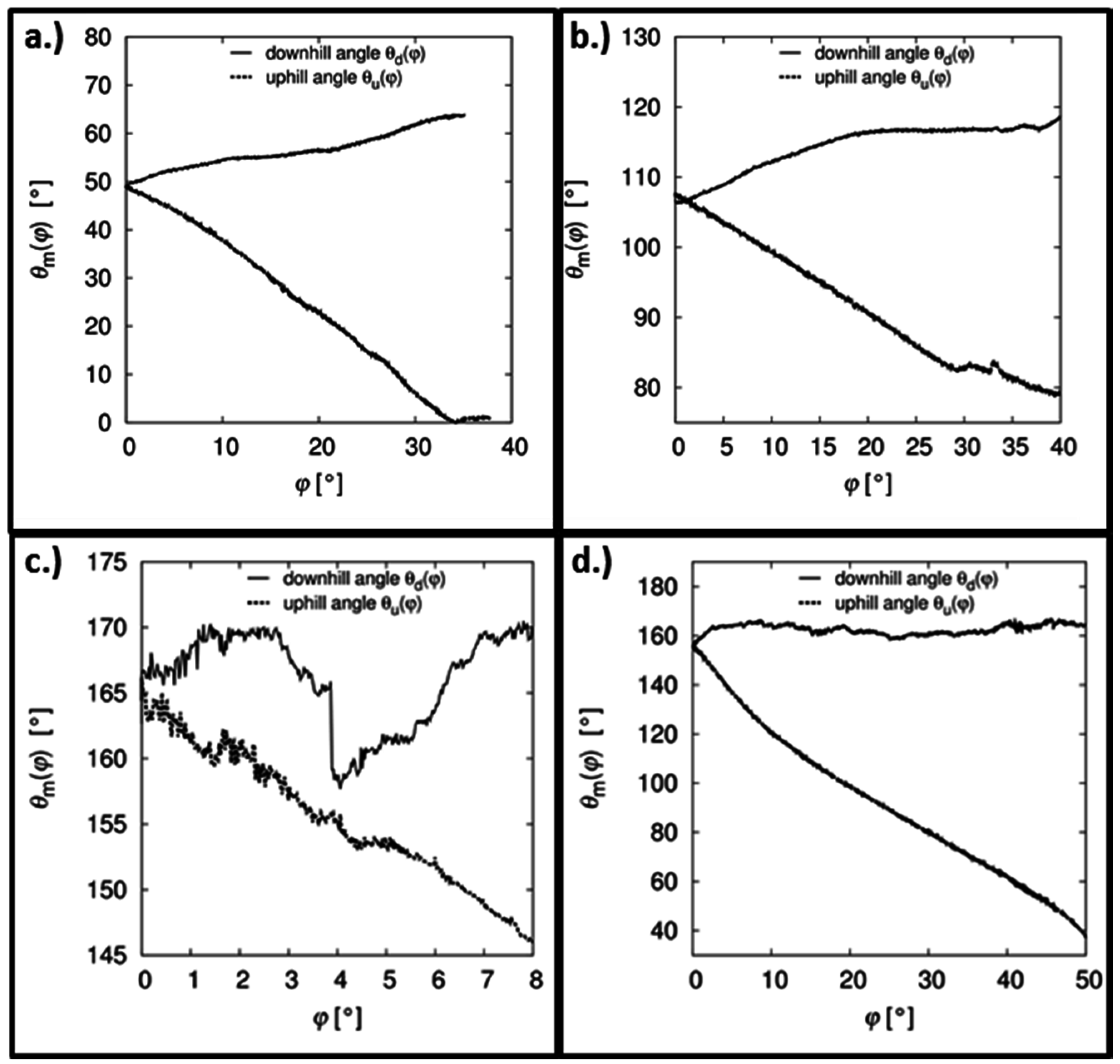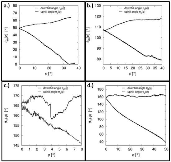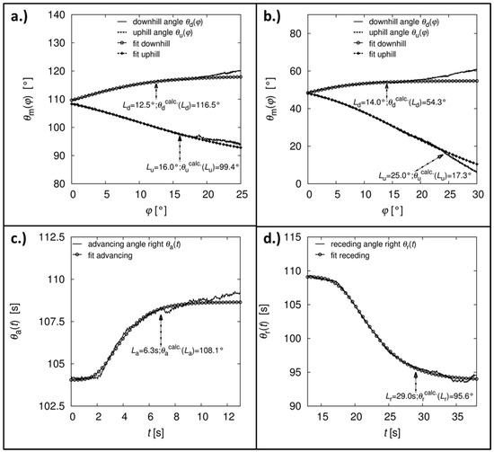 Corresponding Residual contact angles for the examples in Figure 6: (a) inclining-plate measurement on a non-sticking surface; (b) inclining-plate measurements on a sticking surface; (c) advancing angle; and (d) receding angle during a horizontal-plate measurement.