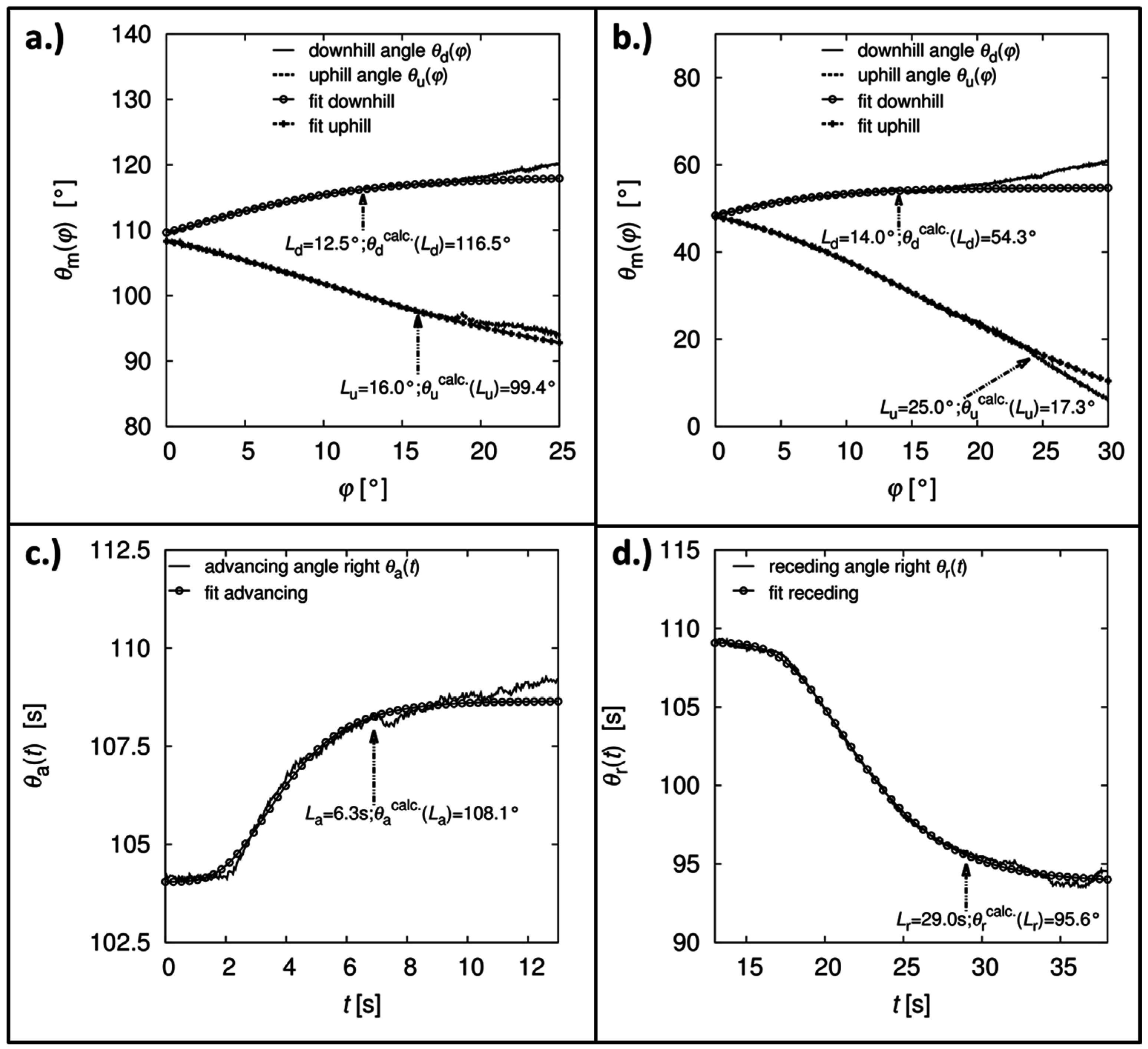 The Gompertzian functions thereby simulate an “idealized” steady course of contact angles relative to the dependent parameter without any unsteady behavior due to non-uniform pinning (e.g., slip-stick behavior, non-uniform slip behavior). The fitting limits for the downhill Ld and uphill Lu, respectively advancing La and receding Lr motion are manually definable and are generally defined at the point, when the motion transition from the slow-moving (triple line velocity ), which corresponds to a quasi-static wetting situation, to the high-velocity range (≡ macroscopic motion) is observed. In this range it can be assumed that the contact angles are almost independent of further parameters such as fluid dynamics and friction, resulting in significant differences from the idealized course of contact angles. To obtain more specific information about the wettability of a surface, the so-called Residual contact angles can be calculated by subtracting the individual Gompertzian function from the corresponding measured course of contact angles using Equations (33)–(35),