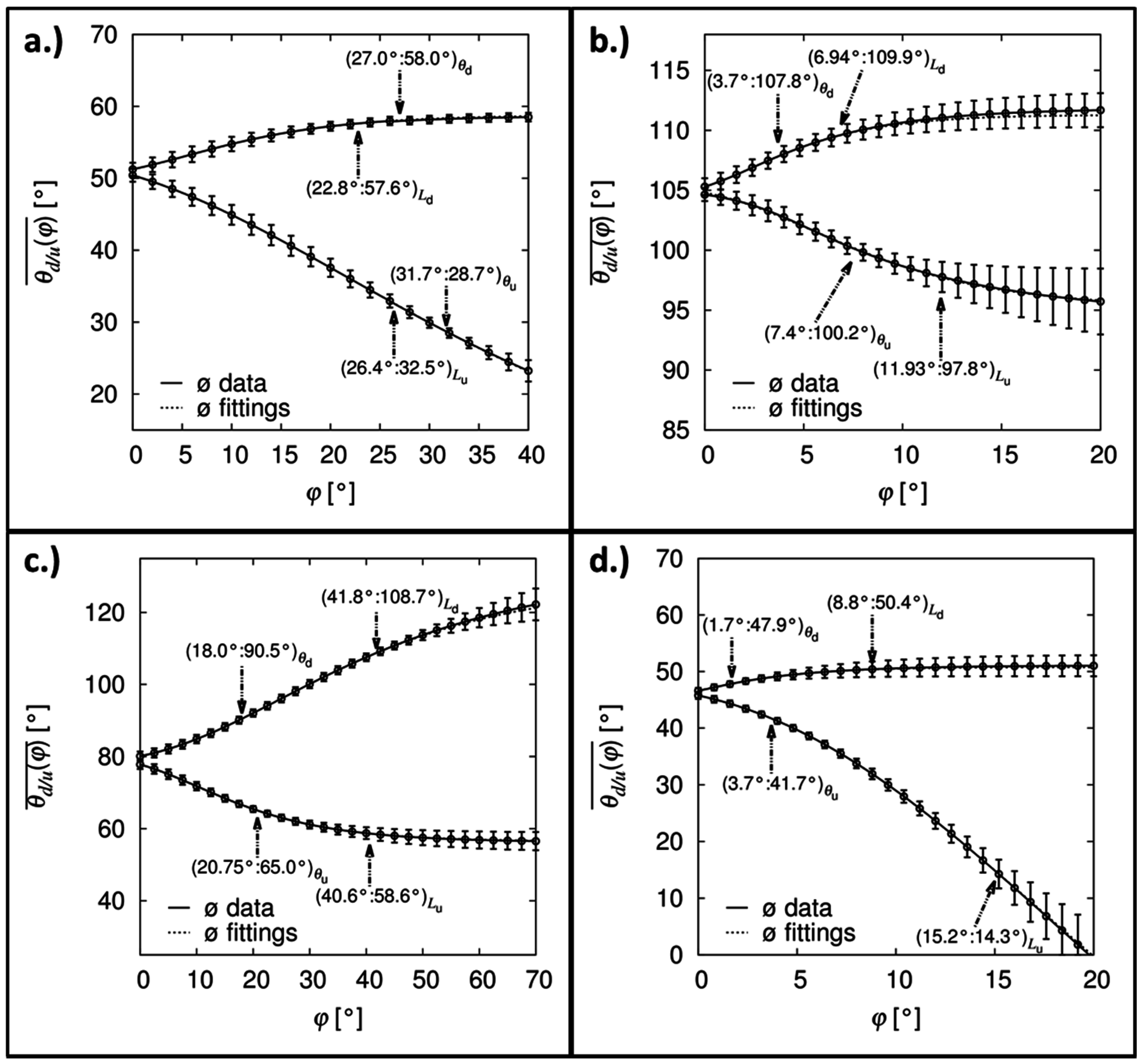 Example for the determination of the static downhill θd,e (a,c) and static uphill θu,e angle (b,d) in dependence on the shift of the triple point coordinates ΔXB10 with the high-precision drop shape analysis on: a non-sticking surface ((a,b) mono-aminopropylsiloxane (APS) coated silicon surface); and on a slip-stick surface ((c,d) line structured hydrophobic modified silicon surface).