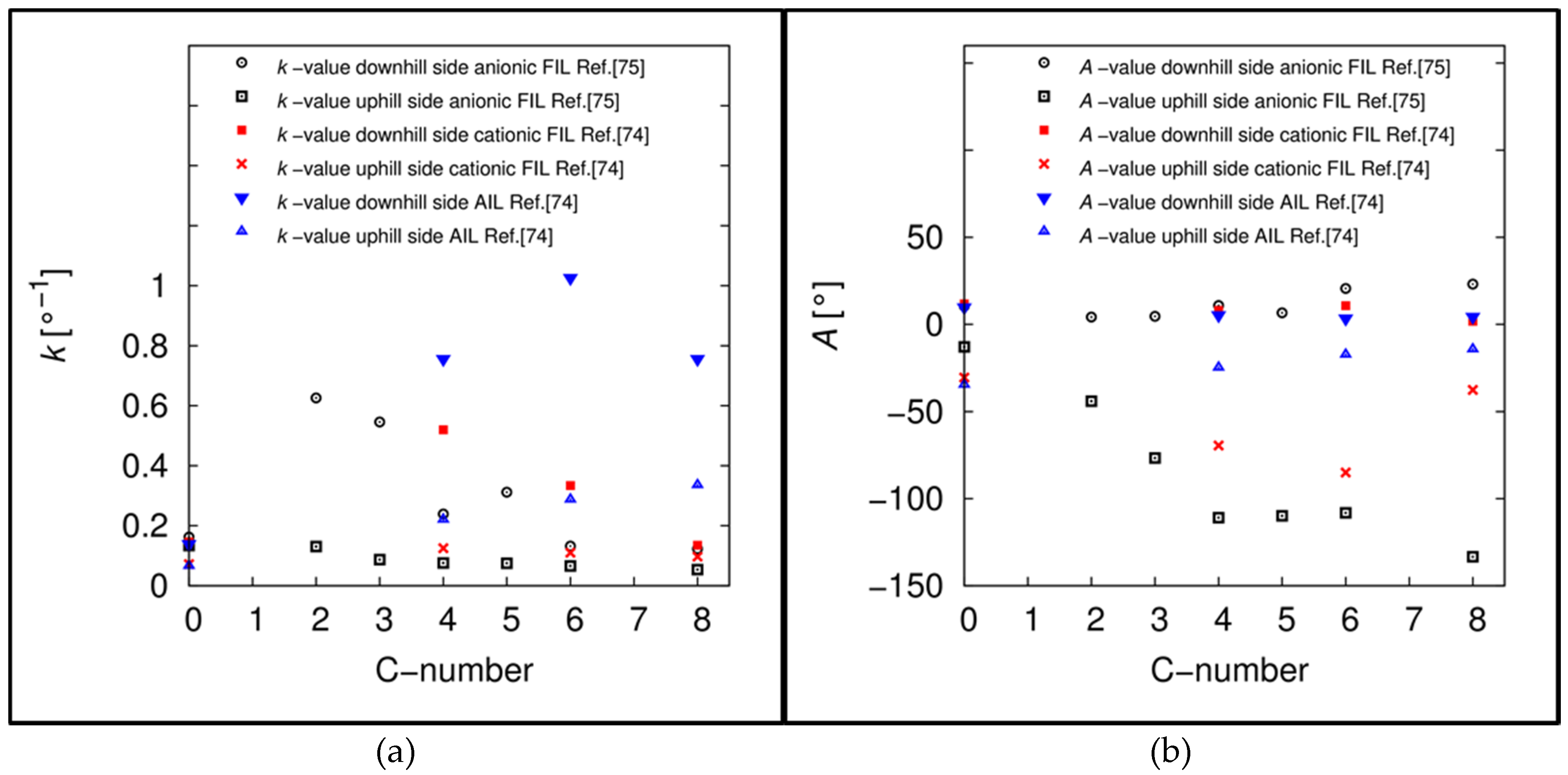 Plot of the k-values (a) and plot of the A-values (b) from the averaged Gompertzian functions against the number of carbon atoms in the side chain of the anionic fluorinated ionic liquids (black, [74]), cationic fluorinated ionic liquids (red, [73]) and the non-fluorinated alkyl ionic liquids (blue, [73]) as contact angle test liquids on hydrophobic modified silicon surfaces. The C number = 0 refers to the contact angle measurements with water as test liquid.
