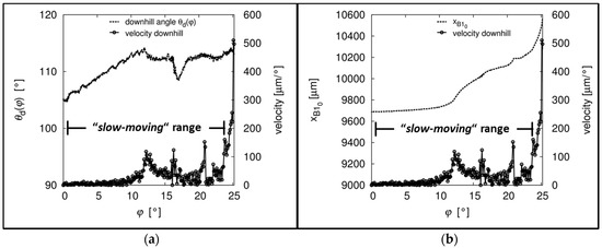 Plot of the downhill angle and the triple line velocity relative to the inclination angle φ (a). Plot of the coordinates of the triple points XB10 and the triple line velocity relative to the inclination angle φ (b). The slow-moving range (vel ≤ 200 μm/°) is visualized in both figures.