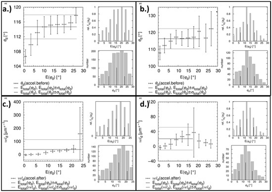 where is the inclination rate of the sample desk () and f is +1 for downhill movement and −1 for uphill movement. To define the spectrum of contact angles that will be considered, the contact angles are classified by two conditions: contact angles during a constant velocity (zero or limited) and contact angles during an acceleration/deceleration event. In the second case, the angles are defined before, during and after the acceleration/deceleration, which corresponds to common definitions for specific contact angles. Thereby, the contact angle data for every measuring position are considered as independent random experiments. To identify the contact angle events, the change of the triple line velocity between two neighboring images is calculated by Equation (39),
