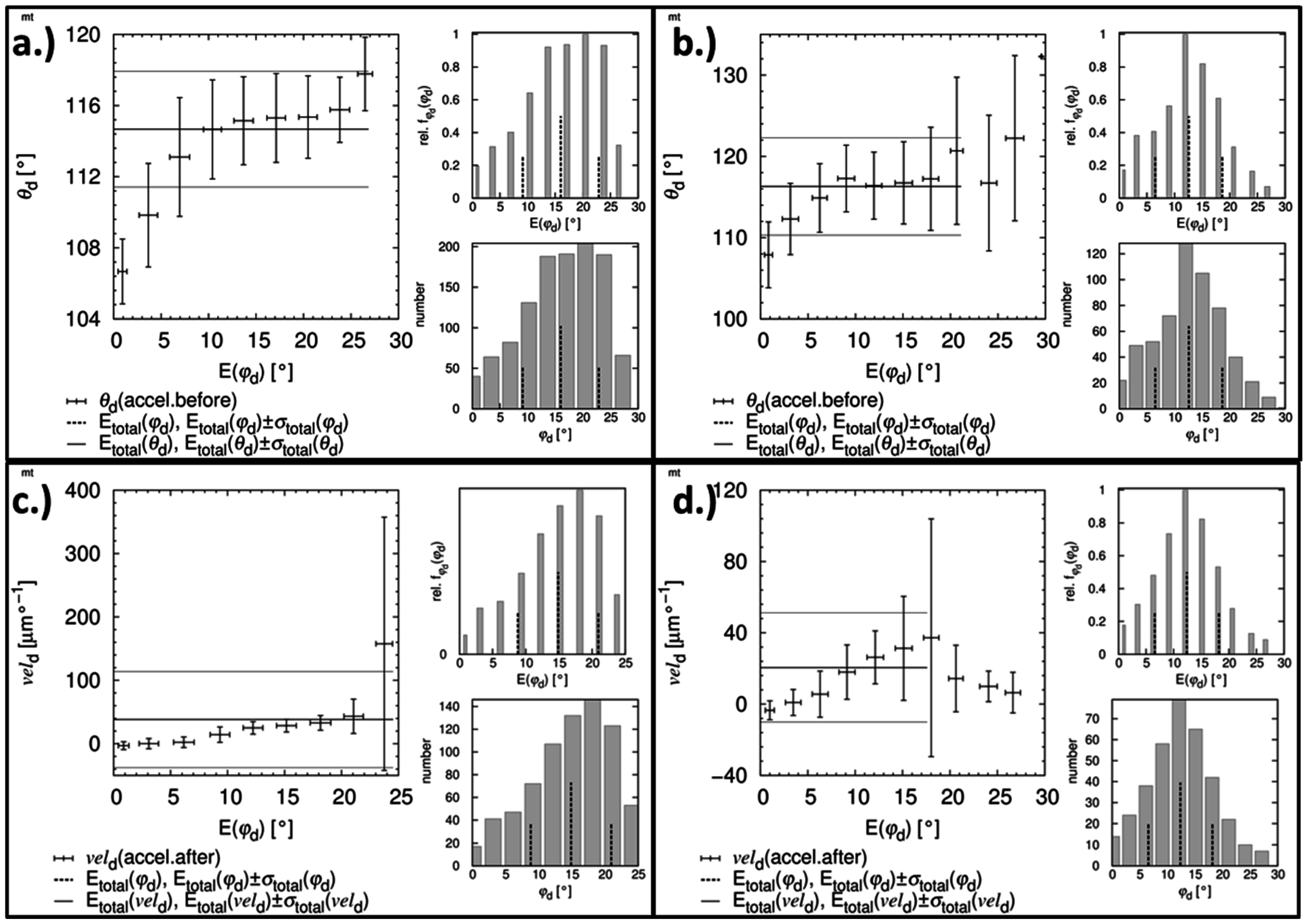 Example for a density distributions with inclination angle φ as independent parameter and contact angle θ as dependent paramter for contact angle measurements on (a) a flat hydrophobic modified silicon wafer, and (b) defined rough and hydrophobic modified silicon wafer. Example for a density distribution with inclination angle φ as independent parameter and triple line velocity vel as dependent parameter for contact angle measurements on (c) a flat hydrophobic modified silicon wafer, and (d) defined rough and hydrophobic modified silicon wafer [78].
