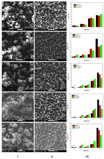 SEM micrographs obtained at (I) 12000× and (II) 1500×; (III) EDS data of the (a) CIS; (b) CIS:Li; (c) CIS:Na; (d) CIS:K and (e) CIS:Cs films obtained at the image apparent bottom (black bar), grain edge (red bar) and grain top (green bar).