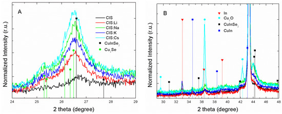 Figure 2A displays the XRD in the region 2θ 24°–29°, around the main peak of tetragonal CIS. In this region, the patterns present a wide peak associated with tetragonal CIS near 26° as well as a shoulder associated with triclinic Cu2Se at 25.3°. The presence of Cu2Se arises from the buffer layer deposited before CIS growth but also could be deposited during growth [15]. A progressive increase of the relative intensity of the main CIS peak is observed from the undoped < Li < Na < Cs, suggesting an increase of the film thickness. The peak intensity in CIS:K shows a decrease with respect to CIS:Na, which could be attributed to the reported influence of K on elemental interdiffusion when added during growth [6]. On the other hand, the XRDs presented in Figure 2B display peaks corresponding to Cu2O at 29.5°, 36.4° and 42.3°, respectively, in all the patterns, but particularly evident in the Cs-doped sample; elementary In is particularly strong in the K-doped sample and a small peak corresponding to CuIn at 34.5° is also evident in the K sample, and both could be attributed to a less complete reaction because the above-mentioned K-dependent hindering of elementary diffusion [9,10]. The presence of Cu2O would arise from the early oxide formed before deposition, but in the case of the Cs-doped film it is evident that it is mostly formed during growth. In a previous report [11], alkaline-doped Cu2O films were prepared by anodization. In that report the Cu substrate was first cathodized in order to “load” it with the alkaline ions, before proceeding to anodization. It was observed that film growth was hindered upon strong Cs absorption onto the substrate. In the present report, in contrast, film cathodic deposition seems to be enhanced when Cs is added during growth. According to the early work of R. Notoya [17], the effect could be attributed to Cs+ adsorption which would lead to a local increase in pH, thus increasing the H2 evolution overpotential, making more efficient the deposition current and therefore the film thickness. The increase in Cu2O formation could also be explained by this increase in local pH, where the source of oxygen would be the decomposed water on the adsorbed Cs+ [17]. Additionally, it is known that alkali metals have a catalytic effect on semiconductor oxidation as they induce polarization in the O2 molecule, leading to easily dissociable O2− [5]; the effect in the electrolyte solution is the above-described increase in pH upon alkali-catalyzed water dissociation.