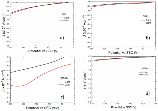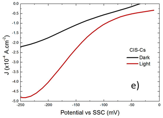 Figure 3 presents the photocurrent response of the films in front of a NaNO3 electrolyte during a continuous potential sweep from OCP to −250 mV vs. the SSC electrode. The films present almost no noticeable photocurrent response (PCR), except for the Na-doped and the Cs-doped films. The lack of PCR can be attributed to the presence of the deleterious Cu2Se phase within the films [18] as well as metallic phases such as In and CuIn, particularly in the K-doped film. On the other hand, the increase in the photocurrent response in the films doped with Na and Cs could be due to the catalyzed oxidation of the semiconductor surface [5] which leads to Se vacancy neutralization, a well-known recombination center in CI(G)S, and the formation of p-Cu2O. Therefore, the effect of Na and Cs will overcome the effect of the deleterious Cu2Se phase through progressive (Cu2Se)1−x(Cu2O)x formation on the Cu2Se surface, as the relative intensities of the Cu2O and Cu2Se/CIS peaks in the Cs- and Na-doped films indicate. In the case of K, the observed formation of metallic phases within the film as well as the proposed KInSe2 compound [9] would deteriorate any photocurrent response, and also there are reports that mention that, in contrast to Na-doping, the beneficial effect of which has been related to VCu capture and thus Cu mass transport [19], K creates electron traps, particularly on Cu-poor CIS films [20], which would also deteriorate the photocurrent response, as actually observed.