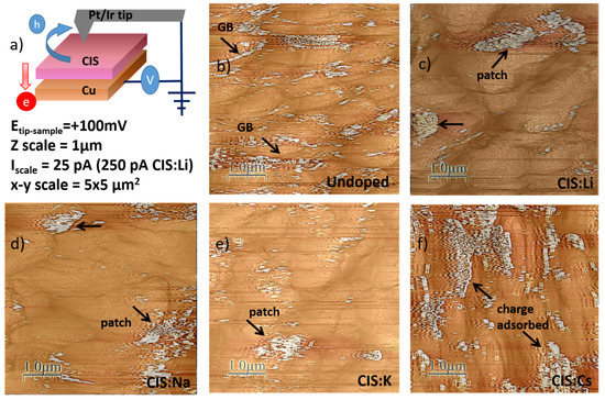 (a) Scheme of the setup of the CAFM measurement and summary of experimental conditions and image characteristics. Over-imposed topography and current images of the films. Arrows indicate current flow paths; (b) CIS; (c) CIS:Li; (d) CIS:Na; (e) CIS:K; (f) CIS:Cs.