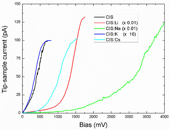 Figure 5 presents the averaged and corrected IV curves, where the displayed curves arise from at least 50 curves acquired in three different locations for each sample. The x-y displacements were corrected for the sake of curve fitting from (0,0). The non-corrected curves are presented in the Supplementary Information (Figures S1–S5). In Figure 5, the curve of the undoped film displays a rectifying behavior in a bias range of 0–750 mV, indicating a short space charge layer, compared with the doped films, possibly due to charged defects and foreign phases. The curve corresponding to the Li-doped film presents a rectifying section up to 1700 mV. Another noticeable feature is the large tip-sample current range (up to 12.5 nA) with respect to the undoped film (ca. 100 pA). The higher conductance of the CIS:Li film is possible due to the substitutional incorporation of the Li CIS lattice, leading to an increase in the carrier concentration [18]. The I–V curve of the Na-doped film shows an extended, well-defined rectifying behavior up to 3000 mV and a current injection from the contacts above 3000 mV. The current level (12.5 nA) is similar to that of CIS:Li. The literature reports that Na-doping is beneficial for CuInSe2 by creating electrically benign defects that are not electron traps [5,6]. The I–V curve of the K-doped CIS film presents very similar characteristics to that of undoped CIS, i.e., rectifying behavior up to 750 mV but a smaller current response, ca. 10 pA vs. 100 pA in the CIS sample, confirming the deleterious effect of K in the electrical behavior, also reflected in the photocurrent response. Finally, the I–V curve of the Cs-doped CIS film shows a rectifying behavior up to 1500 mV. Figures S4 and S5 show that both IV curves from CIS:K and CIS:Cs display large hysteresis as well as x-y displacement. The behavior confirms the charge accumulation observed in the CAFM images leading to the formation of surface capacitors. However, as discussed before, only Cs-doping seems to be beneficial for the photocurrent response, although a deeper investigation of Cs incorporation on the electronic properties is needed.