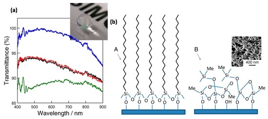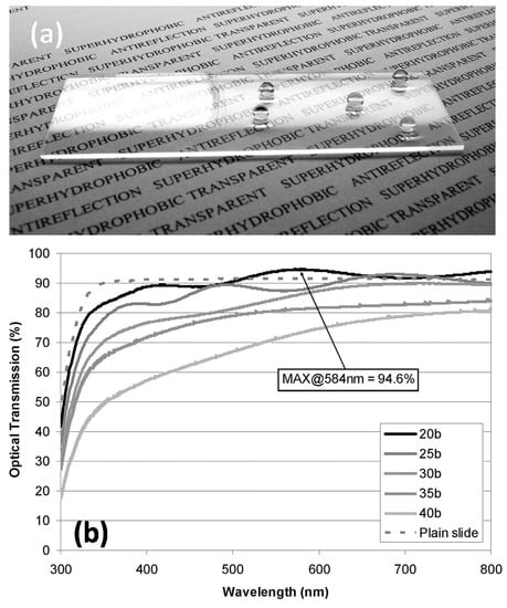 Bravo et al. [26] utilized the layer-by-layer assembly method to control the placement and level of aggregation of differently sized SiO2 nanoparticles within the resultant multilayer thin film. They fully exploited the advantages of layer-by-layer processing to optimize the level of roughness needed to obtain superhydrophobicity and a low contact angle hysteresis and at the same time minimize light scattering (Figure 1a). Besides high transmittance (Figure 1b) and superhydrophobicity, very low levels of reflectivity was also achieved at specified visible wavelengths.