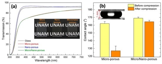 (a) Transmission spectra of ormosil coatings and an uncoated glass substrate. All of the coatings are highly transparent at the visible wavelengths. The inset shows a photograph of transparent coatings; (b) Droplet squeezing between two identical surfaces. Contact angles of surfaces before and after compression. The inset shows the squeezed water droplet between two MNC surfaces. There is only a slight decrease in the contact angle of the MNC after compression. The large decrease in the MC shows loss of the superhydrophobic property [3].