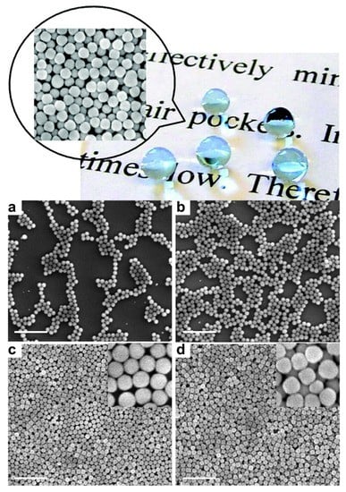 Top Panel: Photograph of the transparent F-SiO2 NP (fluorinated silica nanoparticle film) on a glass slide. SEM images of spin-coated 100 nm F-SiO2 NPs with different concentrations on TESPSA-functionalized Si wafers: (a) 0.1, (b) 0.4, (c) 0.8, and (d) 1.2 wt.%. The insets in c and d are high-magnification images. Scale bars: 1 μm [29].