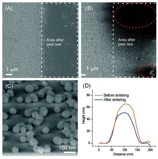 SEM images of the peel test on dip-coated nanoparticle films before (A) and after a sintering process (B); white boxes indicate the areas after peel tests, while red-dot ellipsoids show the area where scotch tape adhesives remained on the substrate after the test; (C) Titled SEM image of the nanoparticles after sintering, and (D) averaged height profiles of the nanoparticles before and after sintering (as measured by AFM) [32].