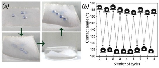 (a) Demonstration of self-healing superhydrophobicity of the coated cotton fabric induced by acetone; (b) WCAs on the coated copper wire mesh in the eight cycles of 1 M HCl treatment [35].