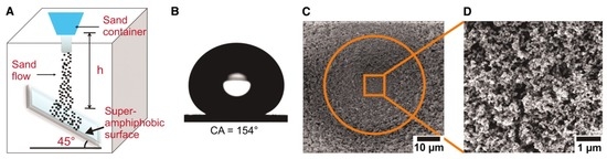 Mechanical resistance quantified by sand abrasion. (A) Schematic drawing of a sand abrasion experiment; (B) Hexadecane drop deposited on the coating after 20 g of sand abrasion from 40 cm height. The 100- to 300-μm-sized grains had a velocity of 11 km/hour just before impingement. After impingement, the drops rolled off after the substrate was tilted by 5°; (C) SEM image of a spherical crater (orange circle) after sand abrasion; (D) SEM image of the surface topography inside the cavity [36].