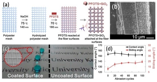 (a) Schematic of the fabrication procedure for the superhydrophobic polyester mesh. First, a polyester mesh undergoes an alkaline treatment with NaOH. Second, PFDTS is reacted on the fiber surfaces using the chemical vapor deposition method. Third, the mesh is treated with SiO2 nanoparticles modified with PFOTS using a spray method; (b) FE-SEM images of the superhydrophobic polyester meshes after 100 cycles of abrasion with a pressure of ~10 kPa. Dashed zone is shows loss of nanoparticle from the fiber surface; (c) Photograph of blue-colored water on the coated polyester mesh surface (left) and a photograph of an uncoated surface on white paper for comparison; (d) Contact angle and sliding angle measurements of the superhydrophobic meshes using aqueous solutions with a pH range of 2–14 [37].