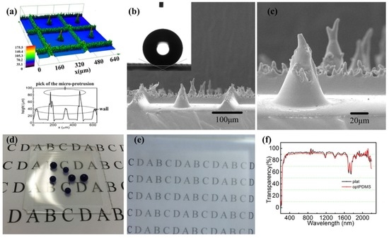 Gong et al. [38] recently reported a convenient and efficient duplicating method, being capable to form a transparent PDMS surface with superhydrophobicity in mass production. They claimed that the fabrication process had extensive application potentials. They used a femtosecond laser processing to fabricate mirror finished stainless steel templates (Figure 12a) with surface structures combining microgrooves with microholes array. Then liquid PDMS was poured for the duplicating process to introduce a particular structure composed of a microwalls array with a certain distance between each other and a microprotrusion positioned at the center of a plate surrounded by microwalls (Figure 12b,c). The parameters such as the side length of microwalls and the height of a microcone were optimized to achieve required superhydrophobicity at the same time as high-transparency properties (Figure 12d,e). The PDMS surfaces showed superhydrophobicity with a static contact angle of up to 154.5 ± 1.7° and sliding angle lower to 6 ± 0.5°, also with a transparency over 91%, a loss less than 1% compared with flat PDMS by the measured light wavelength in the visible light scale (Figure 12f). They tested wear resistance by sandpaper over 100 cycles of abrasion. The superhydrophobic PDMS surfaces were also tested for thermal stability up to 325 °C.
