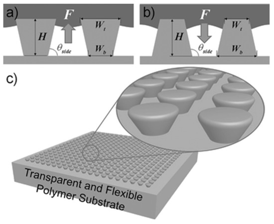 Kim et al. [40] demonstrated highly transparent super-hydrophobic surface fabrication approach using nanoimprint lithography with a flexible mold (see Figure 14). They also applied a PDMS-based coating to achieve both a highly transparent super-hydrophobic surface and an anti-adhesion layer coating for high-resolution nanoimprint lithography by intrinsic low surface energy and easy release of PDMS. The PDMS-coated flexible mold was used repeatedly, more than 10 times, without losing the anti-adhesion property of PDMS and endured severe chemical cleaning processes, such as sonication, which were performed periodically to wash the mold after several consecutive imprinting.