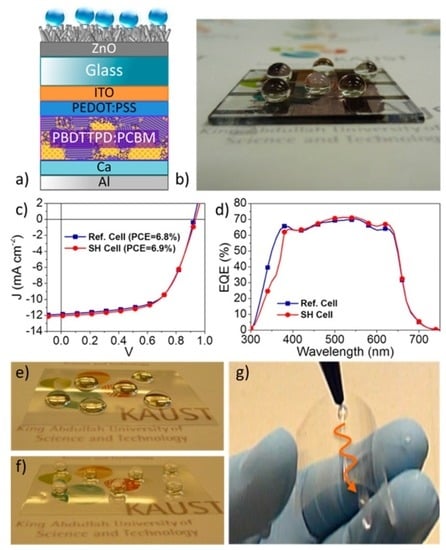 (a) Schematic of a BHJ polymer solar cell including the SiO2/ZnO nanocomposite; (b) Water droplets positioned on the front of the superhydrophobic device remain perfectly spherical; (c) J–V characteristic of a superhydrophobic (SH) cell (red circle) superimposed on that of a bare reference (Ref.) cell (blue square); AM1.5G solar illumination (100 mW·cm−2); (d) EQE spectra of the SH cell (red circle) and the Ref. cell (blue square); (e) Water droplets positioned on a bare transparent sheet of PET (2 × 2 in.2); (f) Droplets positioned on superhydrophobic PET (static angle: 160°); (g) PET retains its superhydrophobicity upon repeated bending (×350) [43].