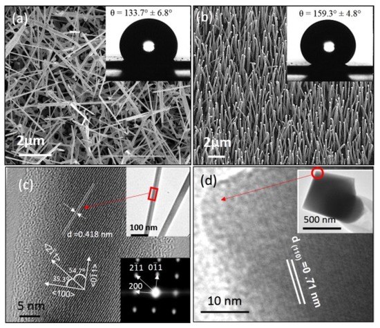 FESEM images of (a) randomly distributed and (b) vertically aligned IO nanorods. The insets show the contact angle images of the respective samples. HRTEM images of (c) randomly distributed and (d) vertically standing IO nanorods. The insets show the TEM and SAED pattern of respective nanorods [44].
