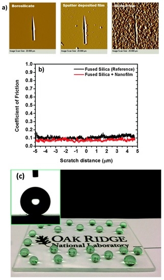 (a) Topographical images of the scratches made on an as-deposited and a nanotextured glass thin film. Image for the underlying uncoated borosilicate substrate is also included for comparison. No debris is observed on any sample, aside from several small and large sized surface-bound particles on the sputtered film. Note that the as-sputtered borosilicate films are generally somewhat rougher than the underlying substrates; (b) Comparison of the coefficient of friction profiles as a function of scratch distance for fused silica substrates with and without a dense borosilicate film; (c) Photograph of blue dyed water droplets on a borosilicate substrate coated with nanoporous antireflective glass film. The film surface is modified by a covalently bonded organosilane chemistry. Inset shows the profile of a 5 μL water droplet resting on a similarly processed film, displaying a static contact angle of 165° [45].