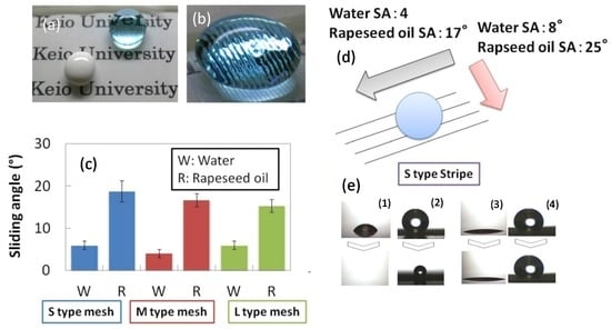 (a) Methylene blue-stained water and white ink stained rapeseed oil on a stripe substrate and (b) enlarged stripe structure in the presence of water; (c) Sliding angle measurements; (d) The droplet of water or rapeseed oil was placed on the mesh/stripe substrate. The substrate was then tilted slowly and the angle was measured when the liquid moved. (e) Thermal stability of mesh and stripe substrates, examined at 80 °C for 10 min. (1)Water (10 μL) on glass, the CA was 44°; (2) Water (10 μL) on L-type mesh, CA was changed from 151.6° to 146.0°; (3) Rapeseed oil (10 μL) on glass, CA was changed from <5.0° to <5.0°; (4) Rapeseed oil (10 μL) on L-type mesh, CA was changed from 141.9° to 141.0° [47].