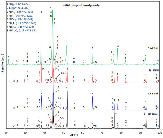 In all samples, some unreacted Ni and Al (except Sp-Ni87-2) are present. This is due to the very limited contact time between particles of Al and Ni during flame spraying (of the order of a few milliseconds). Traces of NiO in all catalysts can be explained by partial oxidation of Ni. There are also traces of NiAl2O4 in all samples. Main products of nickel aluminides correspond to all stoichiometric compositions of Ni: 42.1 wt.% (NiAl3), 59.3 wt.% (Ni2Al3), 65.1 wt.% (NiAl), and 86.8 wt.% (Ni3Al). Also, in the case of 42.1% Ni in the starting powder mixture, an increased presence of Ni2Al3 in the coating was observed. At Sp-Ni87-2, the presence of Ni2Al3, NiAl, and Ni3Al in products denotes the enrichment of the NiAl phase with Ni up to Ni3Al. In the case of Sp-Ni65-2, only the NiAl phase is evident. This result supports the premise that NiAl3, Ni2Al3, and Ni3Al formed from enrichment of the NiAl phase. Figure 2 shows that the maximum content of NiAl and Ni2Al3 phases corresponds to their stoichiometric ratio, respectively (the development of the various phases calculated the peak ratio of intensities of the particular XRD peaks: NiAl, hkl: 220, Ni2Al3, hkl: 110).