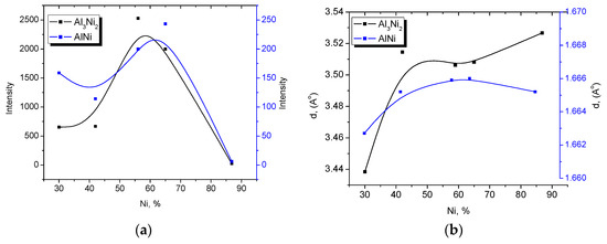Figure 3 shows the influence of Ni concentration in the powder mixture on the parameters of the crystal lattice of NiAl and Ni2Al3. The increase of Ni in the powder spraying mixture enriches constantly the NiAl and Ni2Al3 phases (up to 65.1% Ni for NiAl and 59.3% Ni for Ni2Al3 phase). Increasing the amount of Ni (Figure 3b) increases also the size of the crystal lattice spacing from 3.46 to 3.49 Å and from 3.44 to 3.53 Å for NiAl and Ni2Al3 phases, respectively. This probably occurs because the Ni2+ ionic radius is 0.69 Å and that of Al3+ is 0.51 Å.