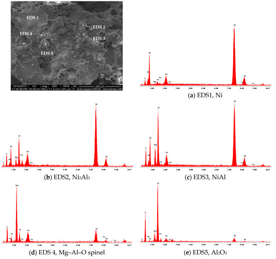 The specific surface area of such catalysts is low—about 0.1–0.35 m2/g (measured by the BET method (Gold APP Instrument Corporation, Beijing, China) on the coatings)—since the spinel substrates used were also made by SHS, which also have low specific surface area due to the large pores present in such substrates, caused by the melting of the coatings during spraying as evidenced by SEM examinations. A coating made by CAFSY from a powder mixture of 59.3%Ni + 40.7%Al on MgAl2O4 spinel studied by SEM/EDS is shown in Figure 4. The EDX spectra are in agreement with the XRD results shown in Figure 2.