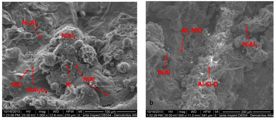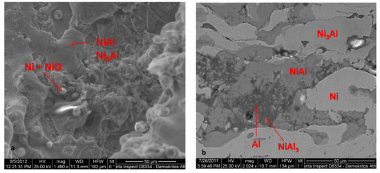 The surface of the coating RB-Ni-65-1 (Figure 6a) shows the presence of the intermetallic phases NiAl and Ni3Al and some traces of NiO. In addition, there are unreacted phases Ni and Al. Cross-section of the same coating (Figure 6b) shows the formation of intermetallic phases NiAl, Ni3Al, and NiAl3 and also some traces of NiO. Combining SEM/EDX analysis with the XRD results of the coatings indicates that the light-grey areas in the SEM micrographs are probably Ni-rich, the dark-grey areas are probably Al-rich, while the intermediate-grey areas are probably the intermetallic phases NiAl3, NiAl, and Ni3Al. The grey-white areas are probably oxides Al2O3 and NiO. The NiAl2O4 spinel phase indicated by XRD could not be found on any surface examined by SEM/EDX.