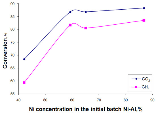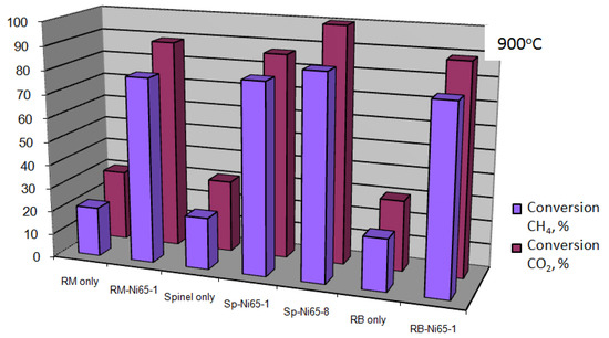 Figure 7 shows that the substrate materials used also display catalytic activity for dry reforming of methane (comparison with data received for substrates without catalytic coatings). The conversion of methane measured on a catalyst containing 4 wt.% nickel aluminide coating on a standard spinel substrate (Sp-Ni65-1) is higher than that for the same coating on the refractory mats (RM-Ni65-1) and the refractory bricks (RB-Ni-65-1) substrates. On the other hand, carbon dioxide conversion was higher on RM-Ni-65-1 and RB-Ni-65-1 coatings than on the RB-Ni-65-1 coatings, where an increase of total content of nickel aluminides (from 4% (Sp-Ni65-1) to 70% (Sp-Ni65-8)) on the substrate leads to an increase of carbon dioxide conversion by 10%.