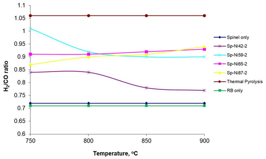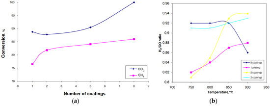 Ratio of H2 to CO in the outlet gas produced by the catalytic reaction depends on the number of coatings as well as the reaction temperature. At high temperatures (Figure 8b, 850 °C) all catalysts produce gases with a ratio of 0.92–0.94, which is suitable for industrial synthesis of alcohols, aldehydes, olefins, acetic acid, and so on. At lower temperatures, 750–800 °C, the number of catalytic layers plays a more significant role regarding the efficiency of the catalysts. It is worth noting that at 900 °C, the activity of the 70% coated catalyst (Sp-Ni65-8) decreases because of coke formation. This could be connected to the increase of contact time on the surface, which increases the concentration of active centres and desorption becomes the limiting factor of catalysis.