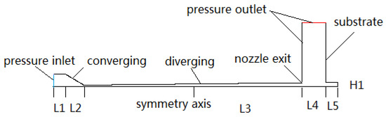 Numerical modeling was performed by using the commercial software FLUENT (version 16.4, ANSYS Company, Pittsburgh, PA, USA) to determine the flow field of driving gas inside and outside the nozzle, and subsequently the acceleration behavior of particles. Due to the geometric axial-symmetrical characteristic of flow in this study, a 2D axial-symmetric model was used for calculation. The physical calculation area is shown in Figure 1 based on the nozzle structure of the cold spray system. The geometric parameters and the working conditions are listed in Table 1.