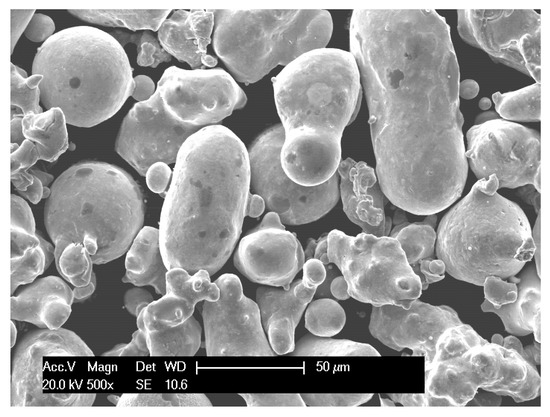 Pure copper plate was used as substrate, abraded with emery paper number 280 and 600 in sequence, then holes of different size were drilled on it. Three kinds of holes were drilled, each hole has the diameter 1000 μm depth 500 μm, diameter 500 μm depth 500 μm and diameter 200 μm depth 1000 μm respectively. Pure copper powder was used to form a coating in cold spraying. The morphology of the powder is shown in Figure 3. The cold spray system used to prepare the coating has the parameters listed in Table 1. The gas parameter in the pre-chamber is 3.0 MPa and 673 K. The compressed air was adopted as carrier gas. The transverse speed of the spray gun is 5 cm/s. The distance between nozzle exit and the substrate is about 25 mm.