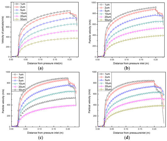 It is apparent that as the diameter of hole becomes narrower, the final impacting velocity of the particle becomes lower. As the holes become narrower and deeper, the ratio of particles with final impacting velocity higher than the critical velocity becomes lower. Then, the deposition efficiency inside the hole is lower than that of the plane substrate. According to uniform morphology of a cold spraying coating, the density of particles impacting the surface within a unit area is constant. Thus, the deposition efficiency difference inside the hole and the substrate leads to different thickness growth rate, which lead to deeper holes. According to literature, the critical velocity is about 550 m/s for copper particles to build up coating in cold spraying. The coating can be deposited in the hole, as the hole is 500 μm in diameter and 500 μm in depth. The coating cannot be deposited in the hole as the hole is 500 μm in diameter and 2000 μm in depth. Also, the coating cannot be deposited in the hole as the hole is 200 μm in diameter and 500 μm in depth. All these simulation results are very consistent with the experimental results shown in Figure 8. There is no doubt that the stationary gas in the hole can decelerate the particle to such a low velocity. For small particles, the inertia of the particle is small and can be changed easily by the gas flow. For large particles, the diameter of the hole is 200 μm, so the particle needs to pile out a large part of the gas in the hole. It worth noting that the gas in the nozzle is very diluted, and the gas in the hole is very dense.