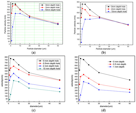 Acceleration behavior of particles in the flow field before the holes with diameter of 3 mm and depth of (a) 0 mm, (b) 2 mm, (c) 5 mm and (d) 10 mm in the substrate.