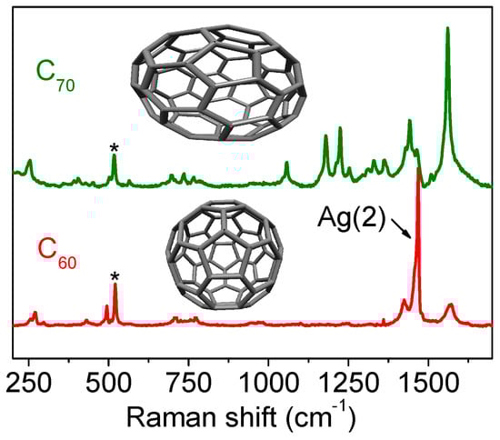 - Dresselhaus, M.S.; Dresselhaus, G.; Eklund, P.C. Raman scattering in fullerenes. J. Raman Spectrosc. 1996, 27, 351–371. [Google Scholar] [CrossRef]