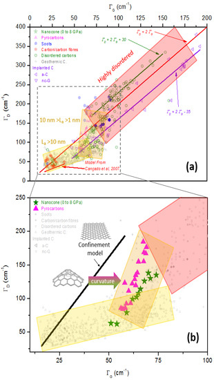 - Mallet-Ladeira, P.; Puech, P.; Toulouse, C.; Cazayous, M.; Ratel-Ramond, N.; Weisbecker, P.; Vignoles, G.L.; Monthioux, M. A Raman study to obtain crystallite size of carbon materials: A better alternative to the Tuinstra-Koenig law. Carbon 2014, 80, 629–639. [Google Scholar] [CrossRef]