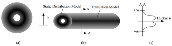 As shown in Figure 1b, when the ESRB moves along the direction A, a stripe-shaped paint deposition area is formed. While moving, the coating thickness of the middle is small because of the hollow area in Figure 1a, and the coating thickness of both sides grows. Figure 1c shows the cross-sectional figure of the paint thickness along the A–A direction corresponding to the deposition of the striated paint in Figure 1b, which shows the variation function of the paint thickness in the y-direction.