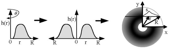 Suppose that the radial thickness profile function of the spatial distribution of the static paint on the plane is h(r); then, the function image is shown in Figure 2. The static radial thickness profile in the figure represents an axisymmetric static spray profile. In order to convert this axisymmetric static spray profile into a dynamic profile or striped paint deposition area, this axisymmetric static spray profile needs to be converted to a circular spray painting model. As shown in Figure 2, the circular spray model can be obtained by rotating the thickness profile around the axis of symmetry.