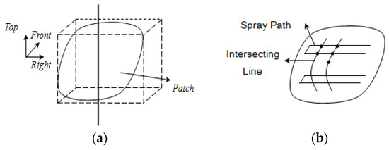 - The cuboid model is established on each patch, and the spatial path of the spray-painting robot on each patch is generated. Figure 5a shows the cuboid model established on a patch. The cuboid model is a cuboid that contains exactly the entire patch, which has two main properties: (i) its leading direction is opposite to the direction of the normal vector of the entire patch, and (ii) the area of the rectangle on each facet is as small as possible. In order to generate the spatial path of the spray-painting robot, firstly, a number of tangent planes whose distance are l (l is taken as R/2–R, R is the spray radius) are taken along the direction perpendicular to the right side of the cuboid model. Then, the intersection between the tangent plane and several segments of the curved surface can be obtained, and a series of points whose distance is d (the optimum value of the overlapping area’s width formed by two spray-painting strokes) are uniformly made on the intersecting line. Finally, these points are connected along the right side of the cuboid mode to generate the spatial path of the spray-painting robot (as shown in Figure 5b).