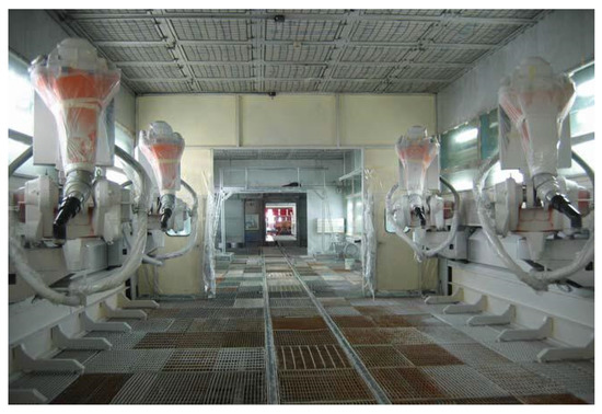 An automobile paint line composed by several spray-painting robots.