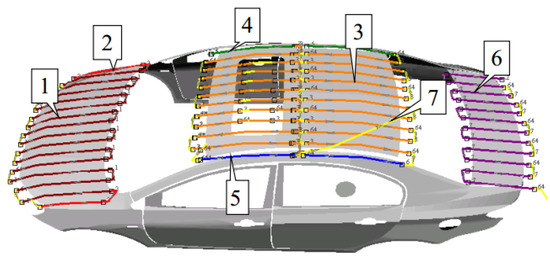 According to the spray model of ESRB and the trajectory optimization method of the spray-painting robot, the trajectory planning is carried out on the four portions of the automobile body. According to the different curvature of the surface and the different shape of the workpiece, we use different trajectory distance, paint flow, and shaping air flow parameters in the planning process. According to the features of the experimental platform for the automobile spray-painting of the spray-painting robot, the joint motion of the robot is smaller and more stable, and the performance is better when the end effector ESRB of the robot moves at uniform speed. Compared with other types of end effectors, the use of the optimal paint flow control can completely replace the optimization method for spray-painting speed in the course of the experiment, as the ESRB itself has an excellent paint flow real-time control adjustment function. That is, after the trajectory optimization for the spray-painting robot is performed in the off-line programming system, the corresponding large paint flow rate is used to paint at the place on the trajectory where the robot needs to move slowly. Conversely, the corresponding small paint flow rate is used to paint at the place on the trajectory where the robot needs to move quickly. Of course, a functional relationship between the moving speed of the spray-painting robot and the paint flow rate needs to be established in this process. This relationship is obtained through the large amount of data after the experimental calibration of the spray-painting robot. The optimized spray trajectories generated by the roof portion, the left portion of the car, and the rear section are shown in Figure 9, Figure 10 and Figure 11, respectively. The roof portion of the car is divided into seven segments of optimization trajectory (the location number of each trajectory has been marked in the figure), the left portion of the car is divided into 12 segments, and the rear portion is divided into three segments. The different segments of the optimization trajectory in the off-line programming system of the spray-painting robot are indicated with different colors. The spray-painting parameters corresponding to each portion of the optimization trajectories are shown in Table 1, Table 2 and Table 3, respectively.