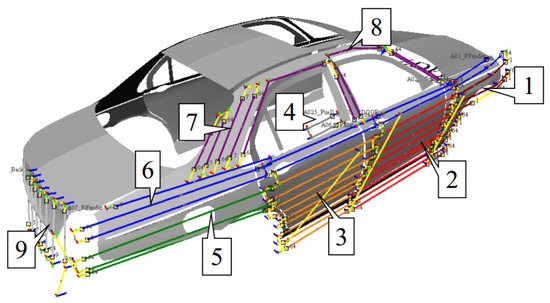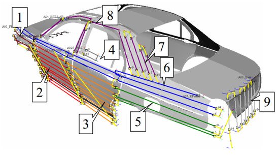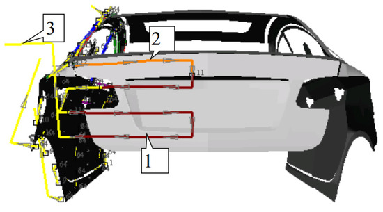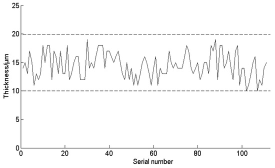 In order to distinguish from the first experiment, the ideal coating thickness is qd = 15 × 10−6 m, and the deviation of the maximum coating thickness is qw = 5 × 10−6 m. The paint thickness date at each sampling point is shown in Figure 17. The coating thickness curve of each sampling point on the automobile body is shown in Figure 18. The thin curve in the figure is the variation curve of the coating thickness, and the data entry has the basic distribution according to the position in Figure 17: The first part is the left side of the body, and the order is from the rear to the front. Then, the order of the second part is: the front, the roof, the rear. The last part is the right side, with the order from the front to the rear. The dotted line in Figure 18 is the upper and lower limits of the standard thickness. The coating thickness basically meets the requirements, and the experimental results verify the effectiveness of the trajectory optimization method.