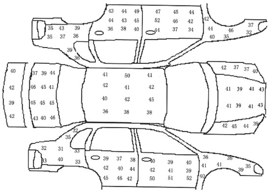 After the paint operation is finished, we dry the paint on the automobile body, and then use the professional QuaNix®7500 (QNIX, Cologne, Germany) coating thickness gauge to measure the coating thickness at each sampling point on the surface of the tested automobile body surface. The coating thickness data at each sampling point is shown in Figure 12. The position of the data in the figure is the corresponding position on the automobile body when the automobile is detected, so we can see the uniformity of coating thickness at all parts of the automobile body clearly. At this point, the reason for the difference in the uniformity of coating thickness can be analyzed according to the surface shape of the corresponding position on the automobile body.