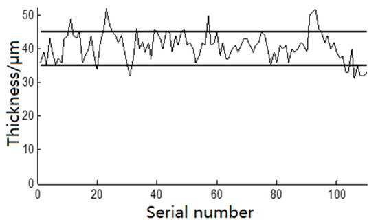 According to the actual spray-painting requirements in the production process of the brand car, the ideal coating thickness is qd = 40 × 10−6 m, and the deviation of the maximum coating thickness is qw = ±5 × 10−6 m. The coating thickness curve of each sampling point on the automobile body is shown in Figure 13. The thin curve in the figure is the variation curve of the coating thickness, and the data entry has the basic distribution according to the position in Figure 12: First is the left portion of the car, from the rear to the front. Second is the automobile body, from the front to the rear. Last is the right portion of the car, from the front to the rear. The thick solid line in the figure is the upper and lower limits of the standard thickness. It can be seen from the graph that only the coating thickness of some discrete points exceeds the upper and lower limits of the coating thickness. The coating thickness basically meets the requirements, and the experimental results verify the effectiveness of the trajectory optimization method.