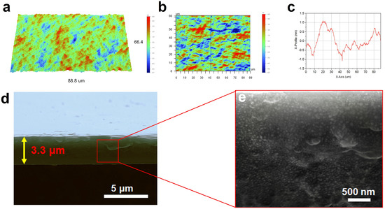 (a–c) 3D and 2D surface profiles of the synthesized HEA film characterized by WLI technique; (d–e) Cross-section view of the HEA film.
