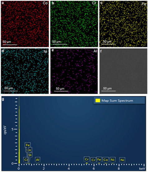SEM–EDS mapping and typical SEM images of the HEA film, indicating the homogeneous element distribution: (a) Co element; (b) Cr element; (c) Fe element; (d) Ni element; (e) Al element; (f) Corresponding original SEM image; (g) The chemical compositions of the HEA film.